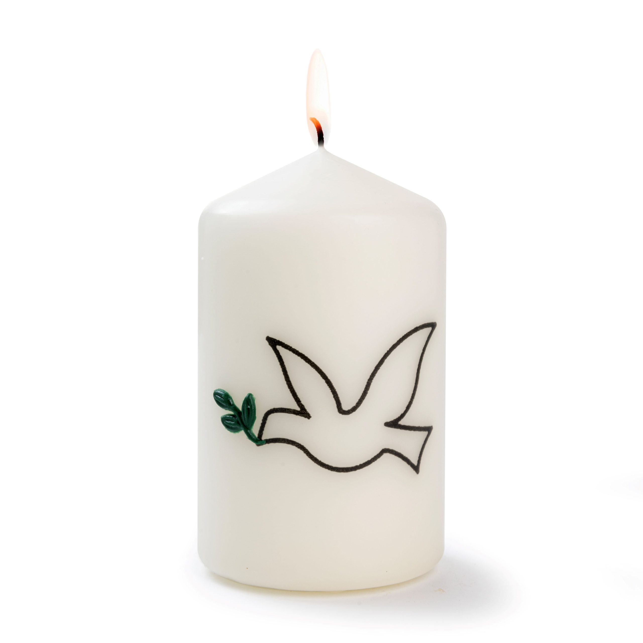 Vrede is kostbaar en helaas ook broos. Bid bij deze vredeskaars met duif en palmtakje voor vrede in de wereld.